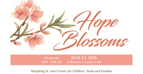 You are Invited to Hope Blossoms 2026!You are cordially invite you to the annual Hope Blossoms gala, taking place on May 13 from 6:00 PM to 9:00 PM. Join us in celebrating St. Ann's Center for Children, Youth and Families' history and mission! Date: Wednesday, May 13, 2026 | Time: 6:00 to 9:00 p.m. | Place: Columbia Country Club |