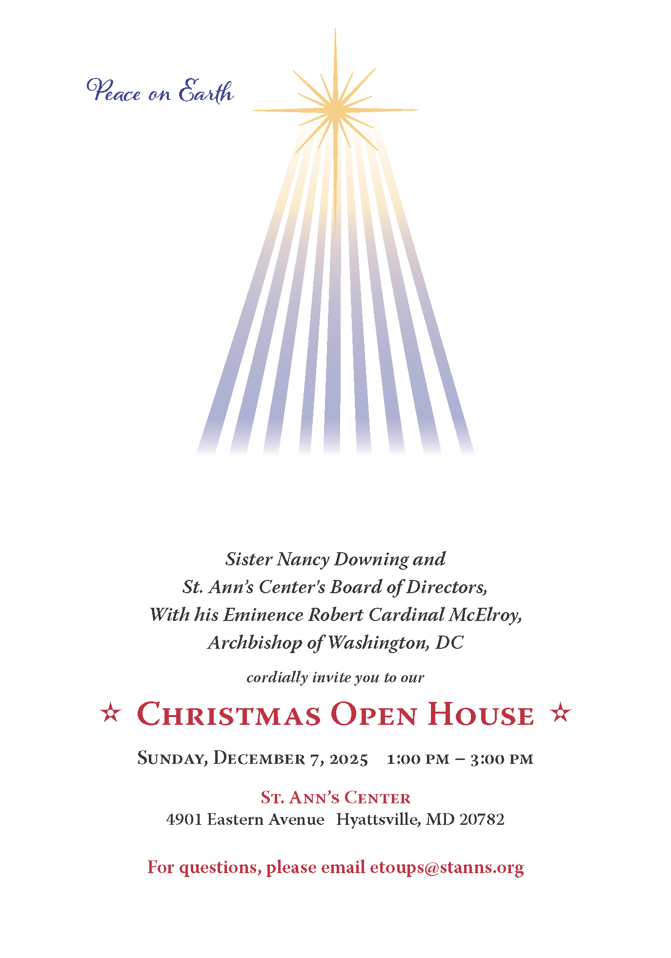 Sister Nancy Downing and St. Ann's Center's Board of Directors, with His Eminence Robert Cardinal McElroy, Archbishop of Washington, cordially invite you to our Christmas Open House.